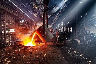 Metallurgical furnace in operation inside an industrial foundry in Guwahati, Assam, India, showing molten metal being poured and workers engaged in the smelting process.