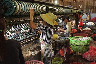 Silk factory, throwing: female workers gain filaments from silk moth pupas and combine them to treads wound on weels with machine help, Dalat, Vietnam